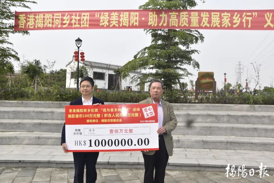2023年4月8日,张仲哲(右)代表香港揭阳同乡社团捐赠100万港币,助力“绿美揭阳”生态建设。